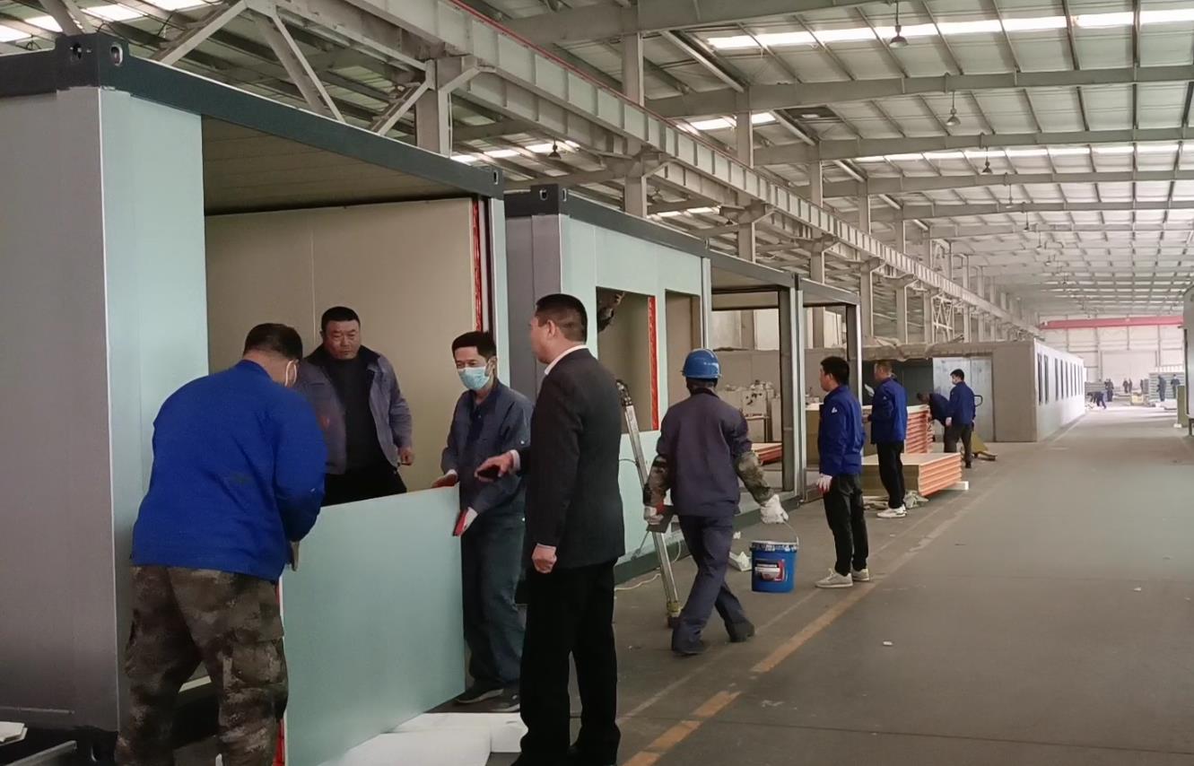 決策下達后,鋼構和集術的30名技術骨干員工很快到達生產現場,綠豐科技的管理人員也聞訊放下手頭工作到車間幫忙抬板,搬運物資。綠豐科技支部副書記、生產副總李公壯勇挑重擔,謀定而動,動員黨員先行,做好表率。生產團隊優化組裝場地,各個部門齊心協力加快生產進度。保障生產,200多名員工吃住在廠區,睡沙發,睡車間,打地鋪。