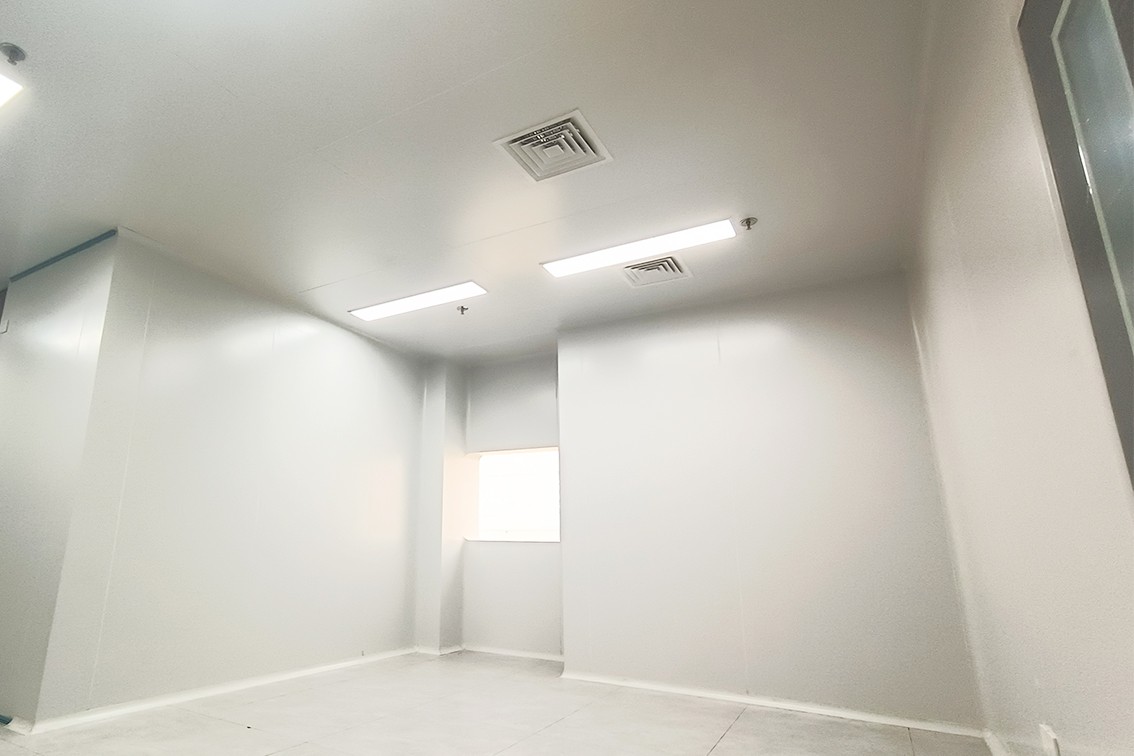 以平為凈,詮釋凈美底色。凈化板面板為純平板面,平整度高、光潔美觀,不易沾灰。潔凈室墻壁、吊頂、照明、門窗及風口處的致密無孔細節密封設計,嚴防灰塵與水汽進入。