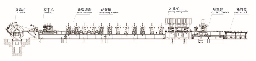 TF鋼板倉加強筋生產線具備中板開卷、校平、輥壓成型,定長沖孔、剪切、卸料等自動化流水生產功能。每一成型道次單獨電機驅動,節能減耗;主機一套輥輪模具可生產1.5-8mm厚的型鋼制件;專用大型壓力機,整體沖孔,確保裝配位置高精度要求。