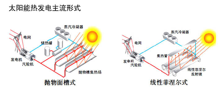 太陽能光熱發電是指利用大規模陣列拋物或碟形鏡面收集太陽熱能,通過換熱裝置提供蒸汽,結合傳統汽輪發電機的工藝,從而達到發電的目的。采用太陽能光熱發電技術,避免了昂貴的硅晶光電轉換工藝,可以大大降低太陽能發電的成本。而且,這種形式的太陽能利用還有一個其他形式的太陽能轉換所無法比擬的優勢,即太陽能所燒熱的水可以儲存在巨大的容器中,在太陽落山后幾個小時仍然能夠帶動汽輪發電。