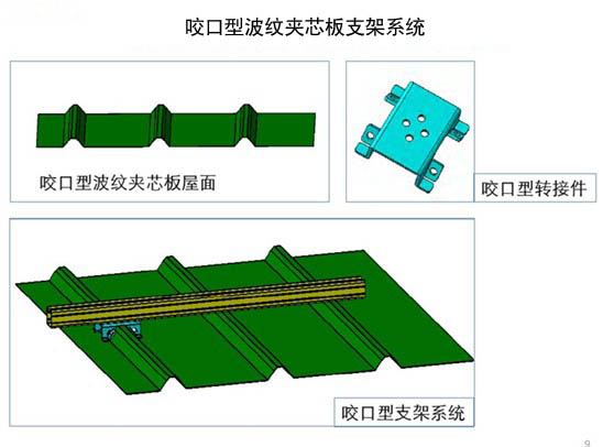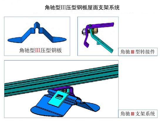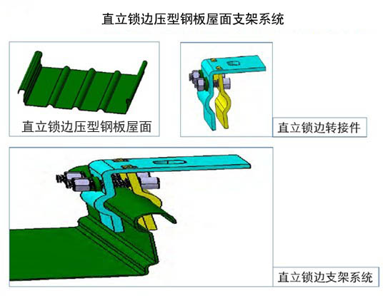 以上三種屋面支架系統,適合于廠房或倉庫等大面積的彩鋼瓦屋頂,采用鋁制或不銹鋼夾塊將系統固定在屋面上。先進的設計,使整個系統的零件種類減到最少,安裝簡單快速。可用于安裝任意規格太陽能多晶硅組件及薄膜組件。
